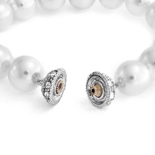 -. Feature : Classic 12mm Simulated Pearl Bridal Bracelet / Simulated 12mm Pearls / Screw Barrel Closure Accented with Pave Set Cubic Zirconia Stones / Material: Brass, Silver Plating, Simulated Pearl, Cubic Zirconia / Weight: 40 gram