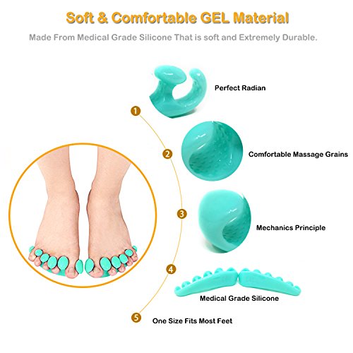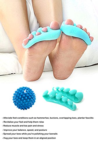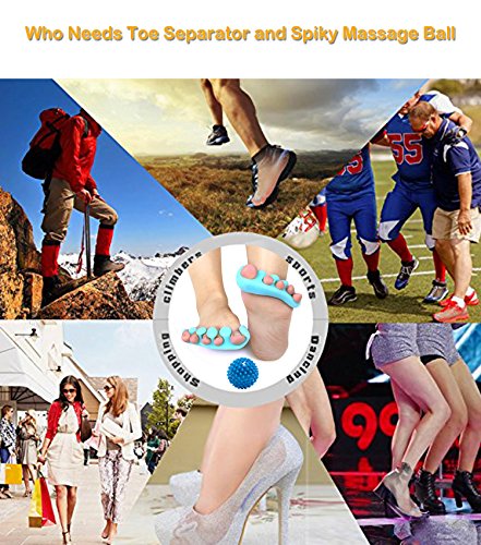 Great Effect: - Our gel separators great for supporting curled hammer toes, help to align the great toe, relieve bunion pain, and deep joint pain between your toes. - Gel Toe Separators also keep interdigital spaces dry, inhibiting fungus growth. Protect sensitive areas, support hammer toes, reduce friction between toes, and ease pressure on sore corns and calluses. - SIMPLE TO USE - They would be for both men and women, you could wears them with shoes(High-Heels, hiking shoes, sports shoes and walking shoes) even while working.and it is OK to wear while sleeping. - It offers unrivaled protection during any activity, like running, climbing or dancing. - Massage Balls can greatly reduce Plantar Fasciitis pain, Release Trigger Points and Muscle Tightness.
