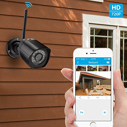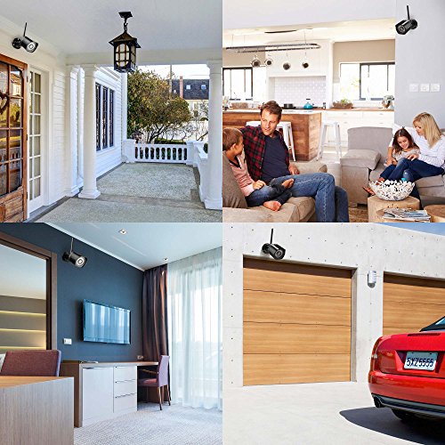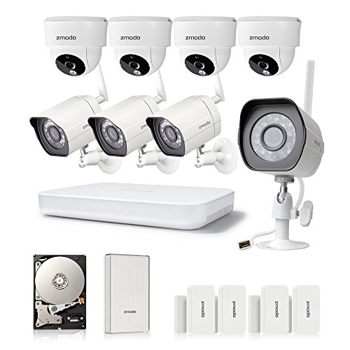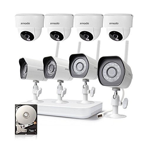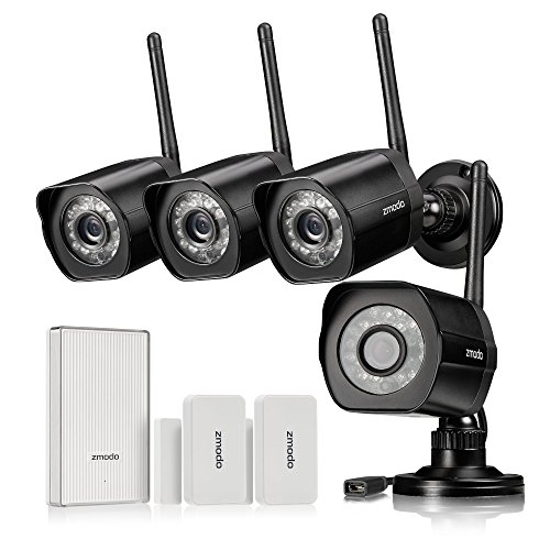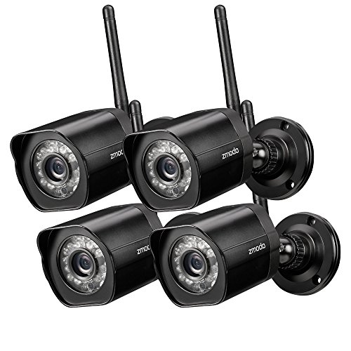 An affordable security solution for your home and business. This wireless home security camera kit can meet all your needs to check on your home, kids, pets or business anywhere and anytime. Quick and easy setup with Zmodo latest connection technology. View video remotely using your smartphone, iPad, or PC. The automatic infrared lights make sure you can see clearly up to 65ft in the dark. You can expand and customize quickly and easily with extra cameras, providing a whole solution for your home and business. IP Camera Specifications * Image Sensor: 720p color sensor * Lens: 3.6mm * Angle of view (diagonal): 77 degree * Night Vision: up to 65ft * Weatherproof: Yes * Connectivity: 2.4GHz WiFi (Incompatible with 5GHz) Package Includes * (4) 720p HD Wireless Camera * (4) Power Supply for Camera * (1) Quick GuideFeature