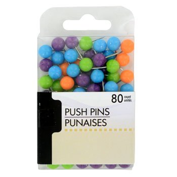 - 80-ct. plastic boxes of assorted round-grip plastic push pins.