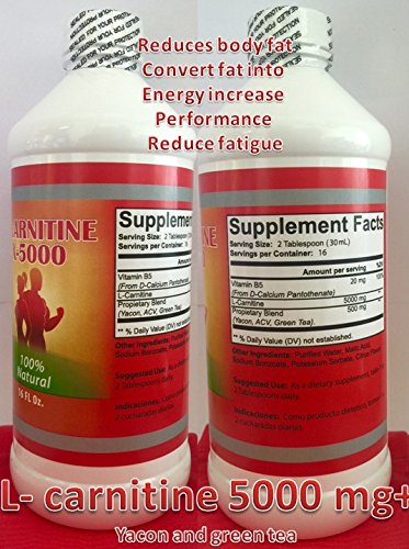 -. Feature : Burn fat fast with 5,000 mg of L-Carnitine Liquid, Essential to helping promote heart health / Promotes energy and fat metabolism. Speeds up your metabolism, Increases energy and endurance while increasing your performance / Natural formula contains no fillers or artificial ingredients. / Vegetarian formula. Contains no sugar, strarch, yeast, wheat, gluten, corn, soy, milk, eggs or artificial colors or flavors. / Bottle contains 16 fluid ounces