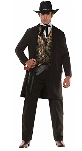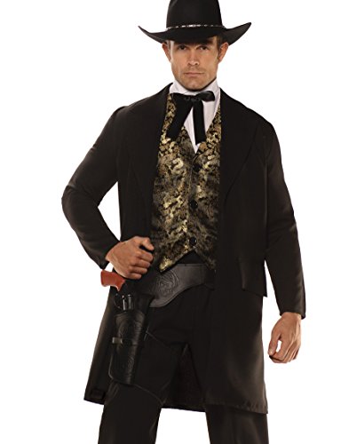 -. Brand : Underwraps -. Color : Black -. Department : unisex-adult -. Feature : Take a gun slinging trip to the wild wild west in this gentlemen's costume. / Black long sleeve jacket with attached vest. / Vest features stunning gold metallic design. / Faux shirt front with attached western style tie. / Hat and gun holster not included. -. Label : Underwraps -. Manufacturer : Underwraps -. Model : 28581-P -. PackageQuantity : 1 -. ProductGroup : Apparel -. ProductTypeName : APPAREL -. Publisher : Underwraps -. Studio : Underwraps -. Title : The Gambler