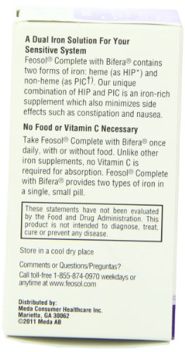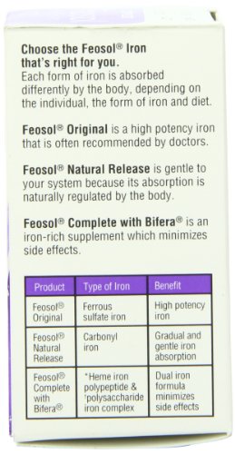 ReleaseDate : 2012-05-15 Studio : Feosol Publisher : Feosol Binding : Health and Beauty Product Description Feosol Complete with Bifera is a patented, high-potency formula that contains two forms of iron: heme and non-heme. Heme iron is animal-based, like the iron in steak. Non-heme iron includes plant-derived iron, like the kind you find in spinach. Feosol Complete minimizes side-effects and enhances absorption. The presence of a heme-based iron enhances iron absorption, while our unique combination of iron minimizes side effects such as constipation and nausea ? delivering the best of both worlds. One pill does it all. Take Feosol Complete once daily, with or without food ? no vitamin C required since absorption is enhanced when the heme form of iron is present. Unlike other iron supplements, Feosol Complete with Bifera provides both heme and non-heme in a single, small pill, so you have the flexibility to take it whenever you want. Feosol - the #1 pharmacist recommended iron supplement brand. 30 tablets 0