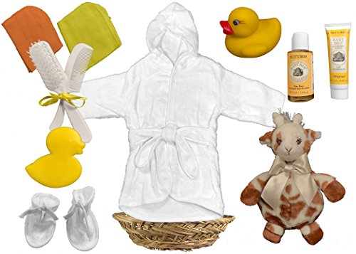 -. Binding : Baby Product -. Brand : Sunshine Gift Baskets -. Color : White -. Department : unisex-baby -. EAN : 0653407420591 -. Feature : Designed as the perfect baby shower gift set to send to a loved one / Burt's Bees shampoo and lotion with a Spongeful sponge for bath time / Plush 6 inch giraffe with a bathtime rubber ducky / 2 assorted washcloths with a comb and brush set / Infant bathrobe (0 to 9 months) with matching soft white booties -. IsAdultProduct : 0 -. Label : Sunshine Gift Baskets -. Manufacturer : Sunshine Gift Baskets -. ProductGroup : Baby Product -. ProductTypeName : BABY_PRODUCT -. Publisher : Sunshine Gift Baskets -. Studio : Sunshine Gift Baskets -. Title : Baby Shower Gift Basket for a Boy or Girl - Giraffe Bathrobe 11 Piece Gift Set -. UPC : 653407420591