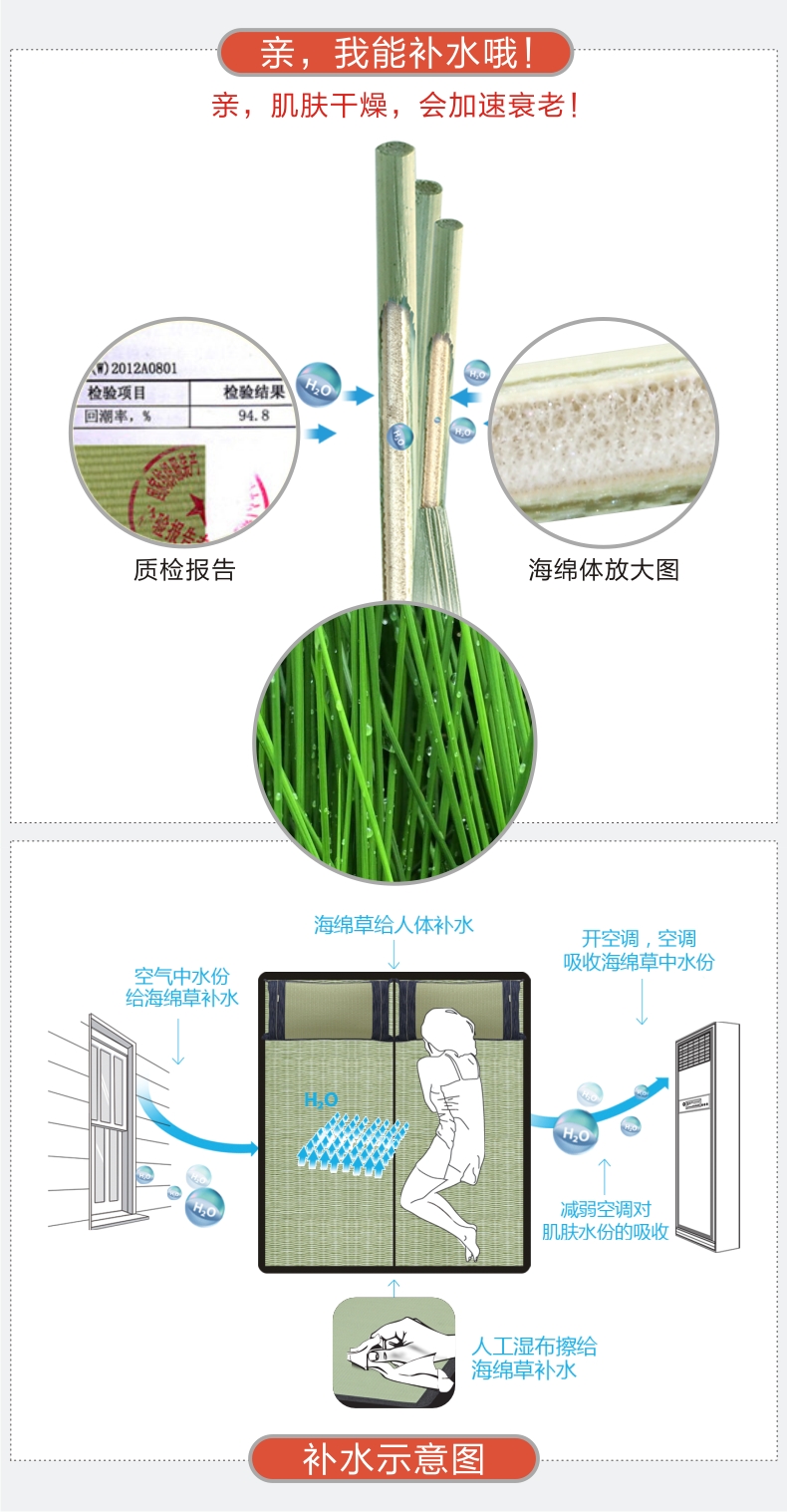 | 产品特点 | 1、海绵草是近几年研发改良的新品种,从外观上看,每根草直径比一般蔺草细,草皮薄,海绵体丰满,有韧性。 2、它能吸水,锁水,从而给肌肤补水。海绵草的最大回潮率达94.8%,也就是说1000克草可以吸收900克以上的水。 |