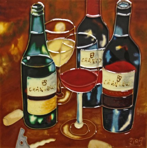Continental Art Center BD-0572 8 by 8-Inch Three Wine Bottles and Two Wine Glasses Ceramic Art Tile
