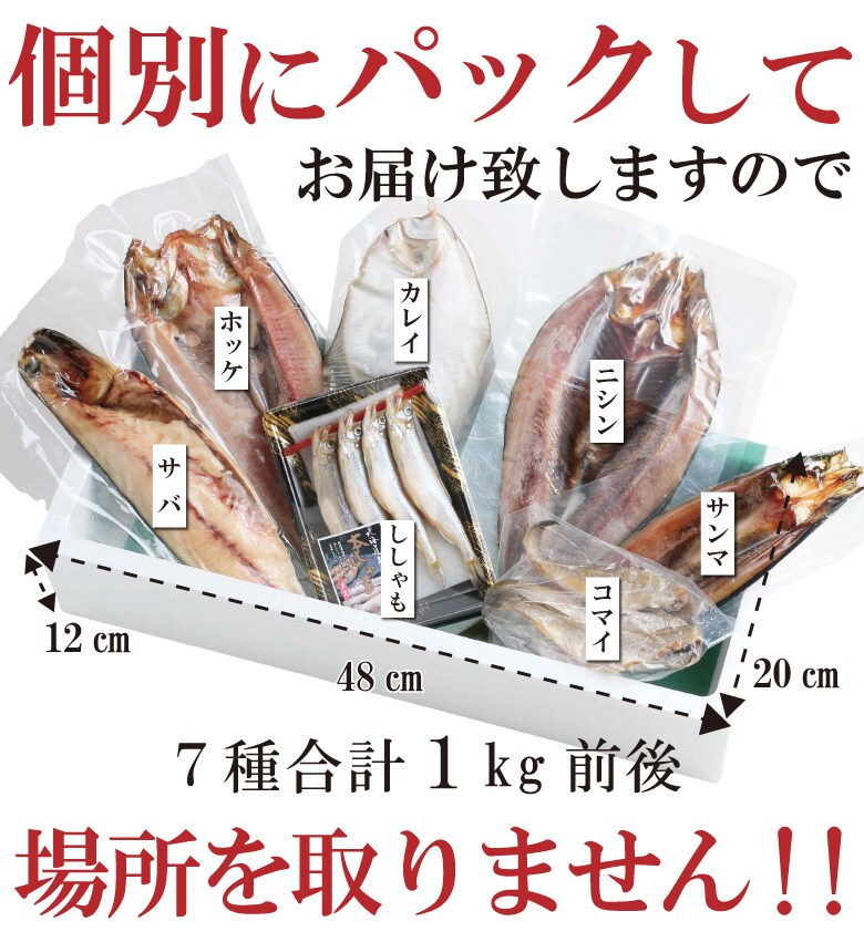 ・原材料/材質/素材:真ほっけ250g前後/北海道産、宗八カレイ200g前後/北海道産、さばフィーレ150g前後/ノルウェー産、 さんま100g前後/北海道産、にしん200g前後/アメリカ/ロシア産、コマイ3-4尾/北海道産、子持ち本ししゃも4尾/北海道産、塩