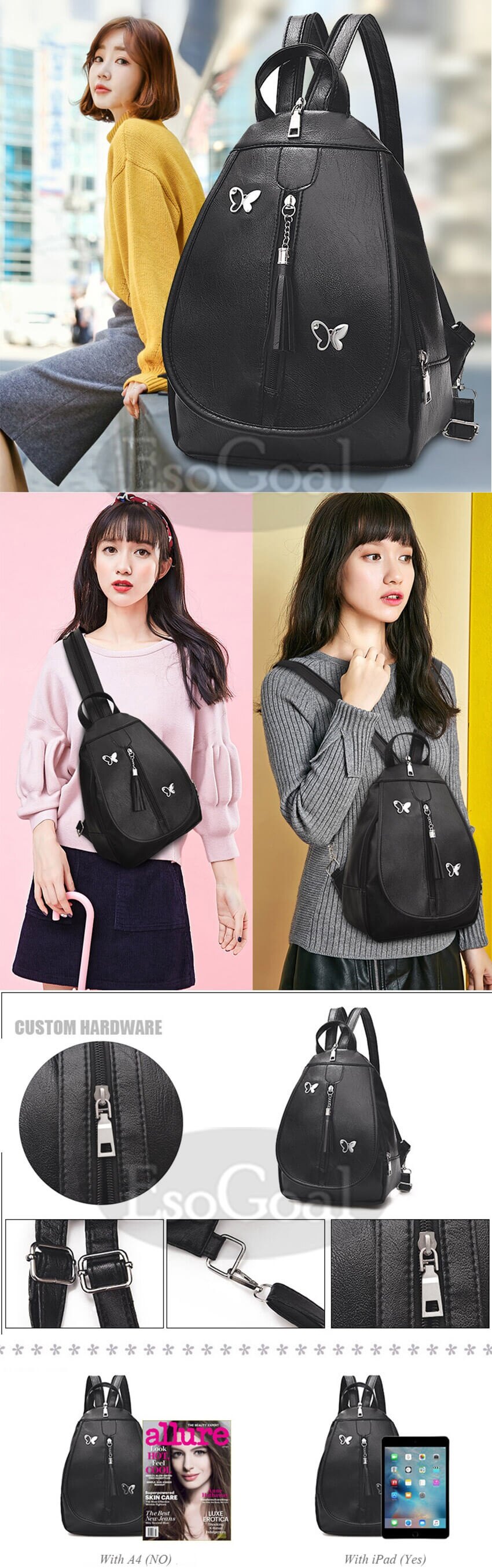 - Structure:2 zippered compartment,1 opening compartment and 1 back zipper pocket