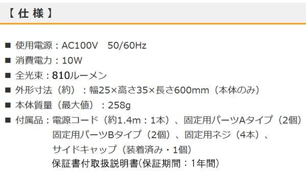 | ムラのない面発光と、広い発光角度(メーカー従来品比)で明るく照らします。付属の固定用パーツ・ネジを使えば、電気工事不要で簡単に取り付けられるので、お店やお住まいの様々な場所で手軽に使えます。本体を含め、最大12台まで連結できます。 |