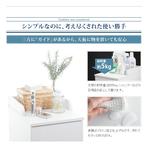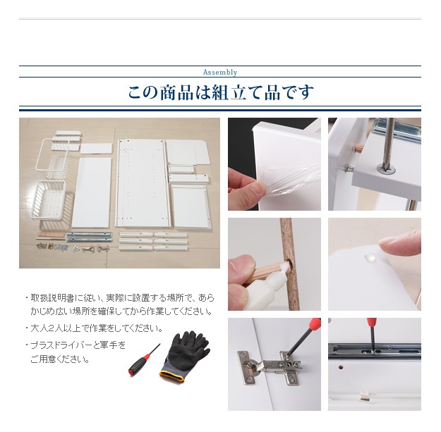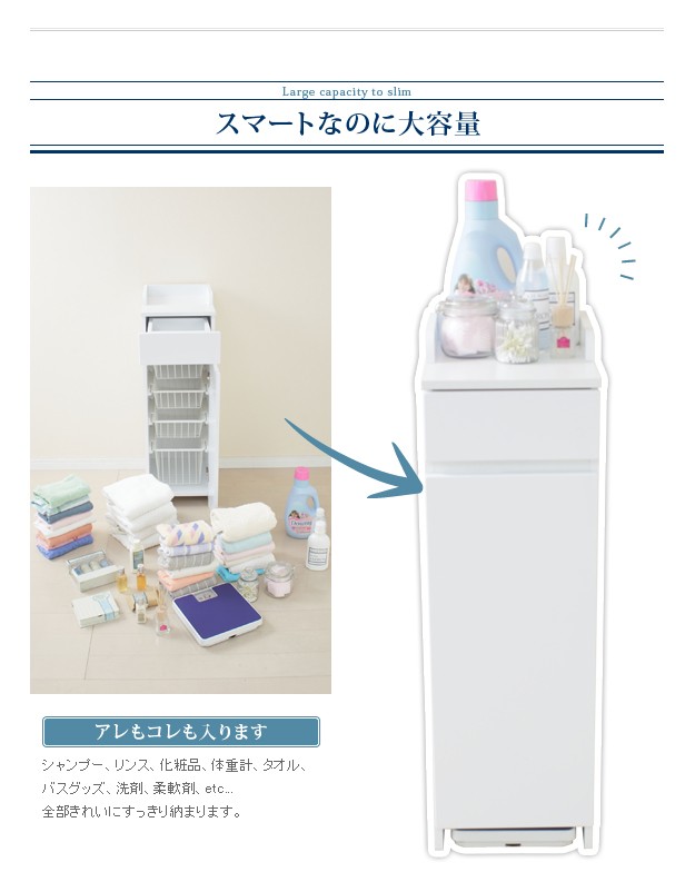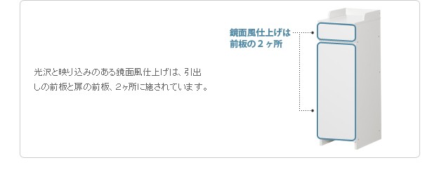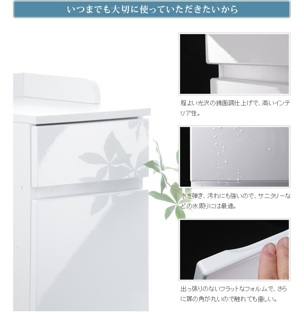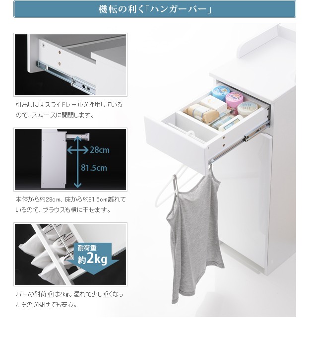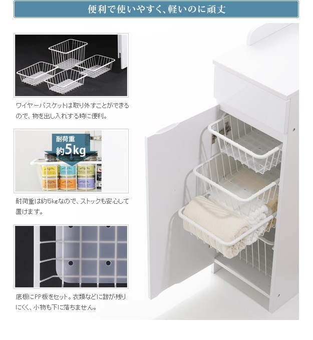 商品について:軽い、頑丈、中身が一目でわかる便利なワイヤーバスケット収納。この商品の為に開発されたオリジナルレールにより、バスケットは引き出しても落ちないのに、簡単に取り外しができるようになっています。引出し手前にはタオル掛けにもなる便利なハンガーバー付きです。表面は水を弾き汚れにも強い素材を使用していますので、お手入れも簡単です。扉と引出の前板は程良い光沢が美しい鏡面仕上げ。