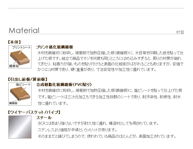 材質:本体-プリント紙化粧繊維板、扉・引出前板-合成樹脂化粧繊維板(PVC真空貼り)、ワイヤーバスケット・パイプ-スチール