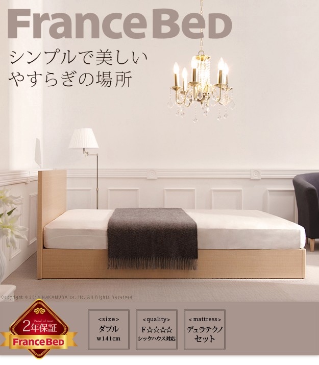 材質:[ベッド]本体-プリント紙化粧合板、[マットレス]側地-ポリエステル50%・ポリプロピレン50%、中身-ウレタンフォーム・パームパッド・ポリエステル綿・防虫不織布・羊毛、コイル-デュラテクノスプリング・コイル数660、通気孔-アイレット加工