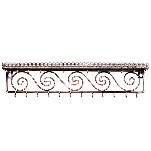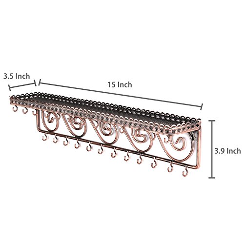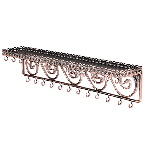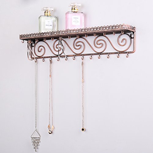 Wall-Mounted Bronze Metal Scrollwork Design Jewelry & Cosmetics Shelf Rack with 25 Necklace Hooks
