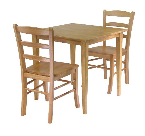 -. Feature : Solid wood construction for durability / Light oak wood finish / 29.5-in. square table: great for small spaces / Shaker-style legs for a classic look / Includes 2 matching chairs with rounded ladder-back