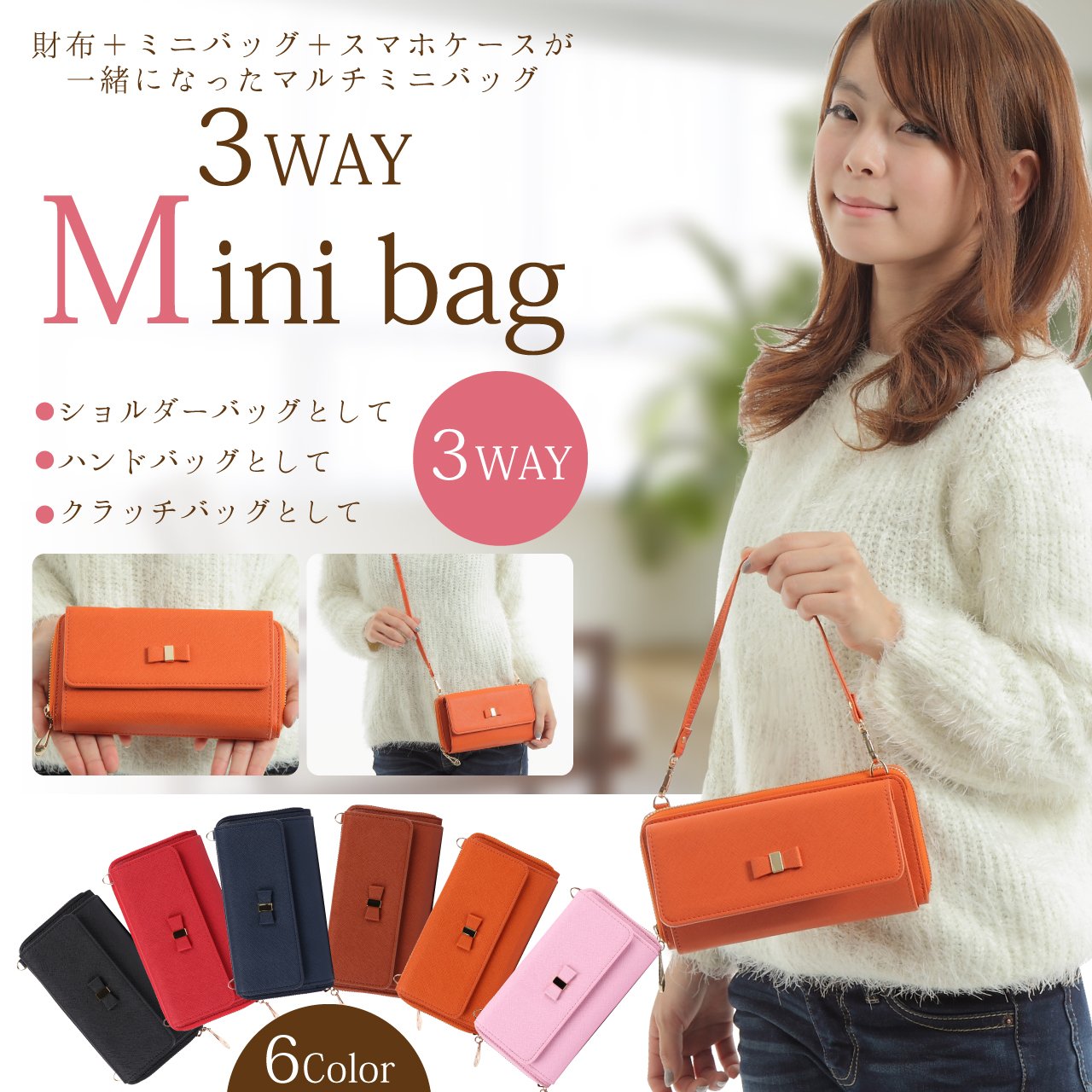 Shoulder bag, handbag, 3 Way type that can be used as a clutch bag or long wallet.