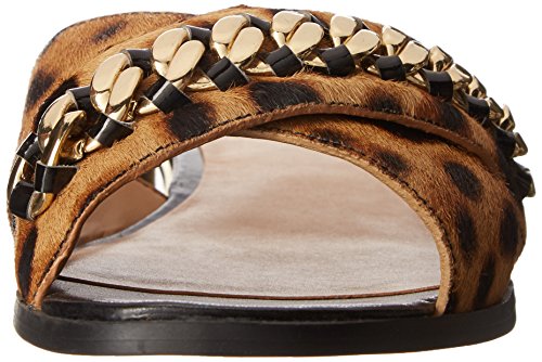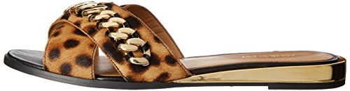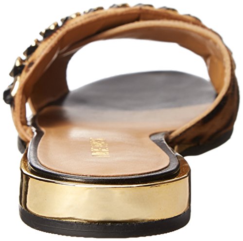 Slide sandal featuring crisscrossed haircalf upper with gold-tone chain overlay