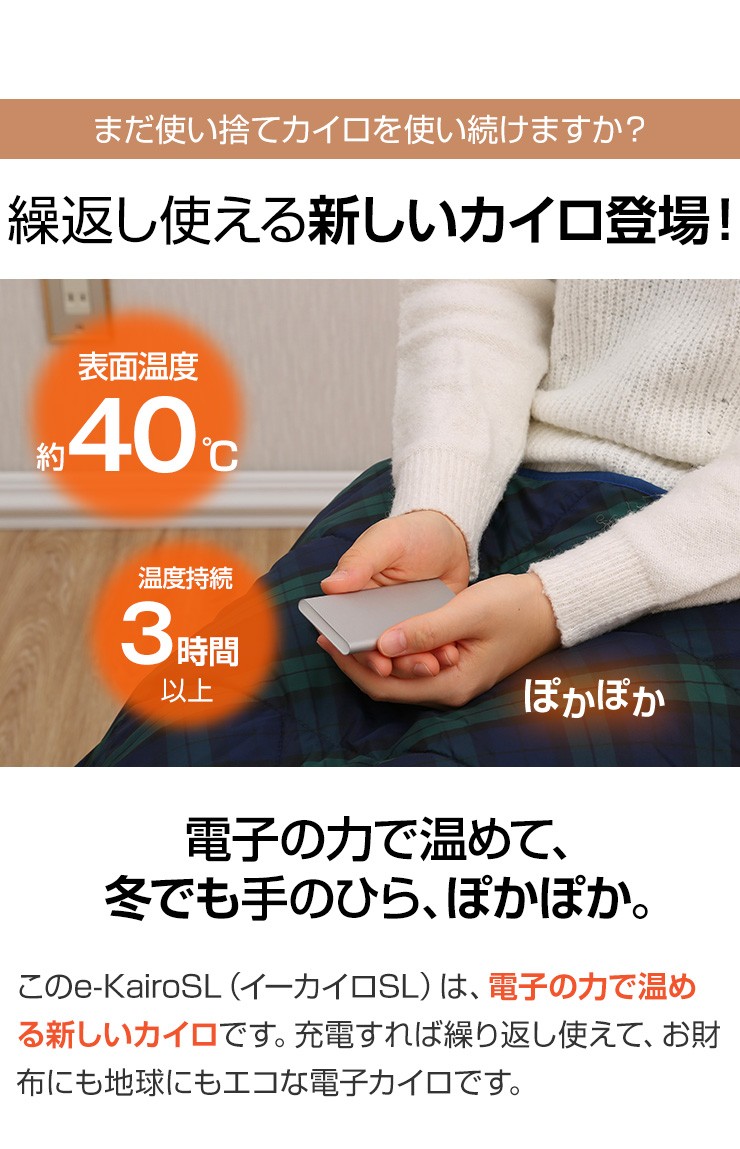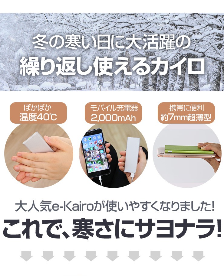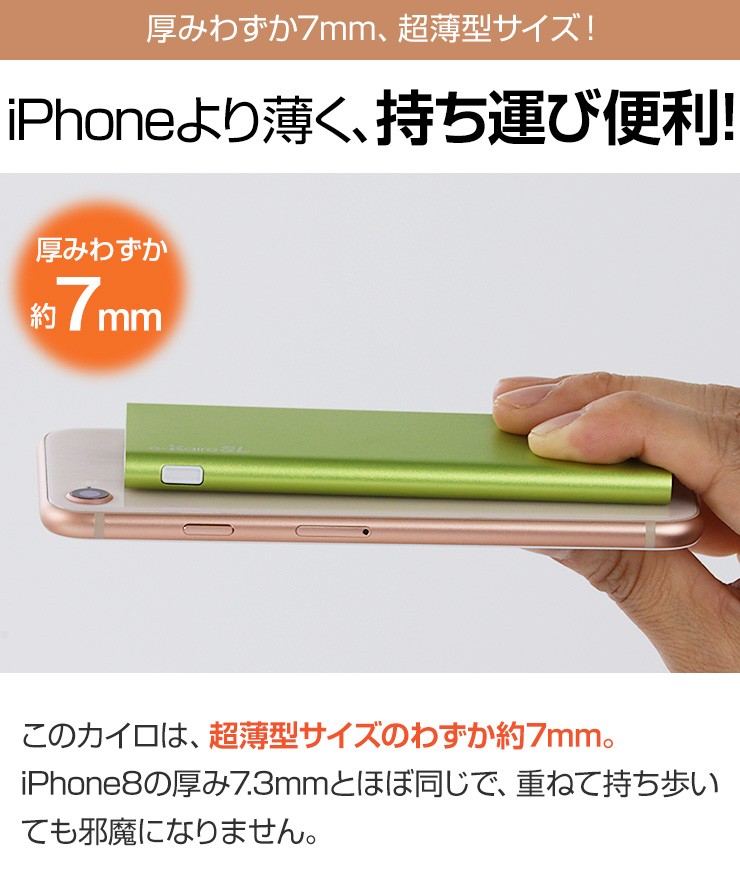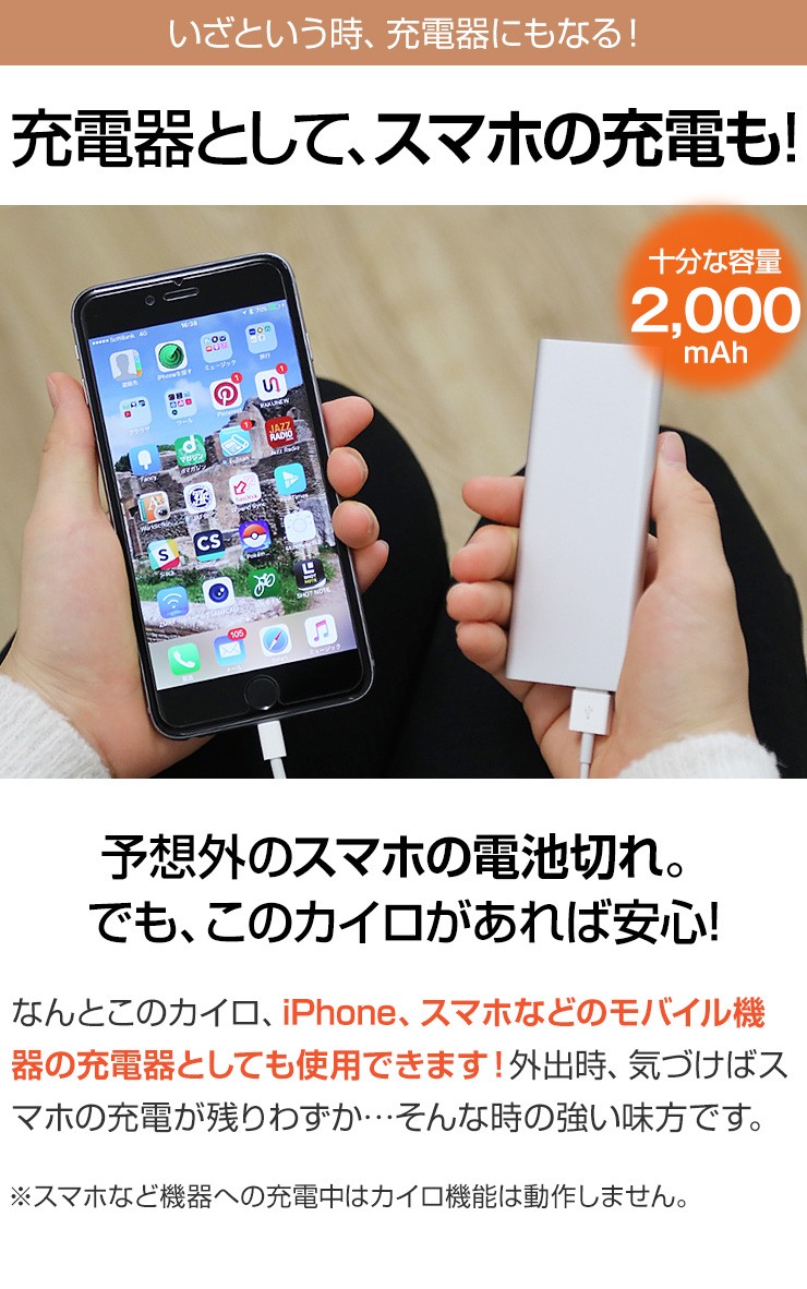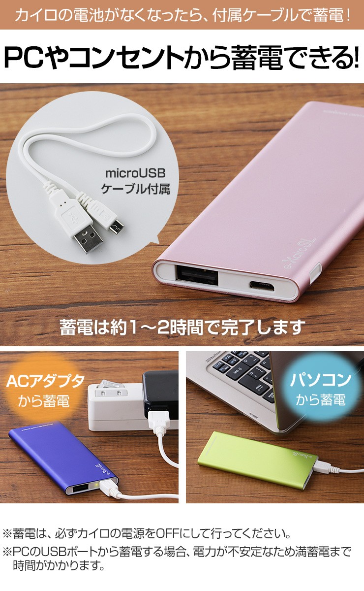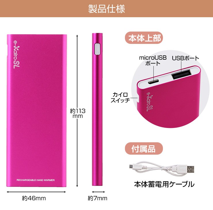カイロ温度:約40度(本体表面温度)※使用環境によって異なる場合がございます。カイロ使用時間:約3~4.5時間(衣服内装着時)※使用環境によって異なる場合がございます。電源:リチウムポリマー蓄電池 3.7V 2000mAh充電時間:約1~2時間(5V 2A で充電した場合)※使用環境によって異なる場合がございます。入力:DC5V 2A Max(USB電源出力からの充電)モバイルバッテリー出力:5V 1A Max素材:アルミ、ABSサイズ:約46 x 7 x 113mm重量:約67g保証期間:お買い上げ日より180日間デジキン