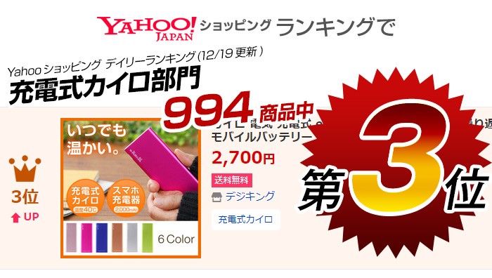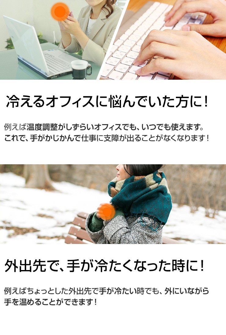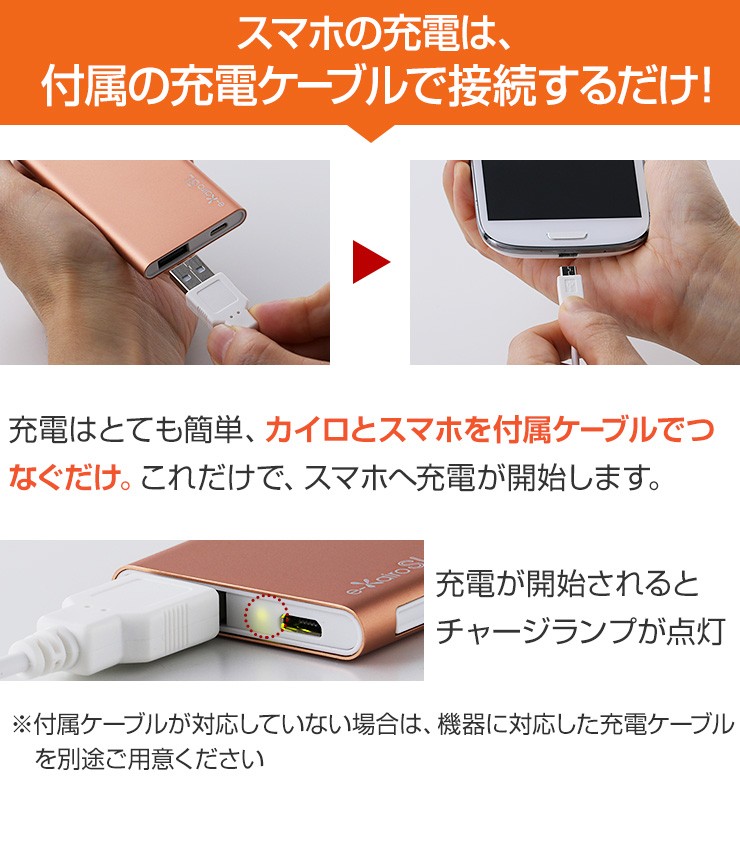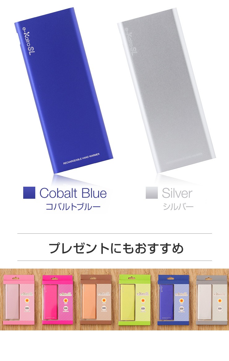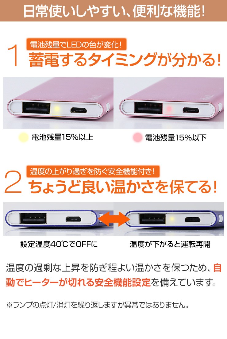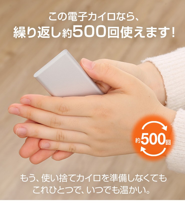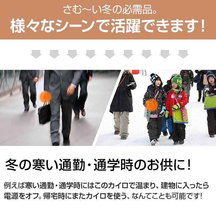 カイロ温度:約40度(本体表面温度)※使用環境によって異なる場合がございます。カイロ使用時間:約3~4.5時間(衣服内装着時)※使用環境によって異なる場合がございます。電源:リチウムポリマー蓄電池 3.7V 2000mAh充電時間:約1~2時間(5V 2A で充電した場合)※使用環境によって異なる場合がございます。入力:DC5V 2A Max(USB電源出力からの充電)モバイルバッテリー出力:5V 1A Max素材:アルミ、ABSサイズ:約46 x 7 x 113mm重量:約67g保証期間:お買い上げ日より180日間デジキン