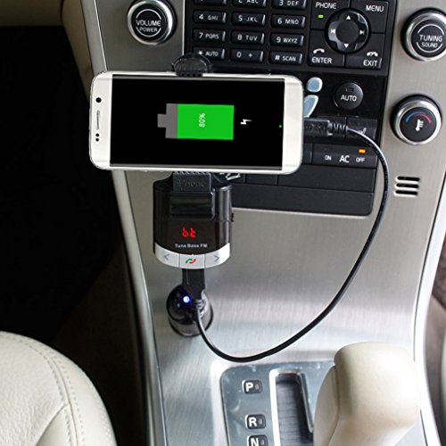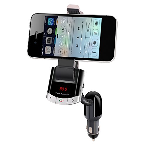 Multifunctional Design: 3 in 1 (FM Transmitter, Phone Holder and Car Charger). Wireless Bluetooth in-car Multifunction FM Transmitter enables you to do Hands-free calling, enjoying clear MP3 music, GPS voice navigation, charging your devices, films watching with loud speakers, independent power switch to easy power on/off.