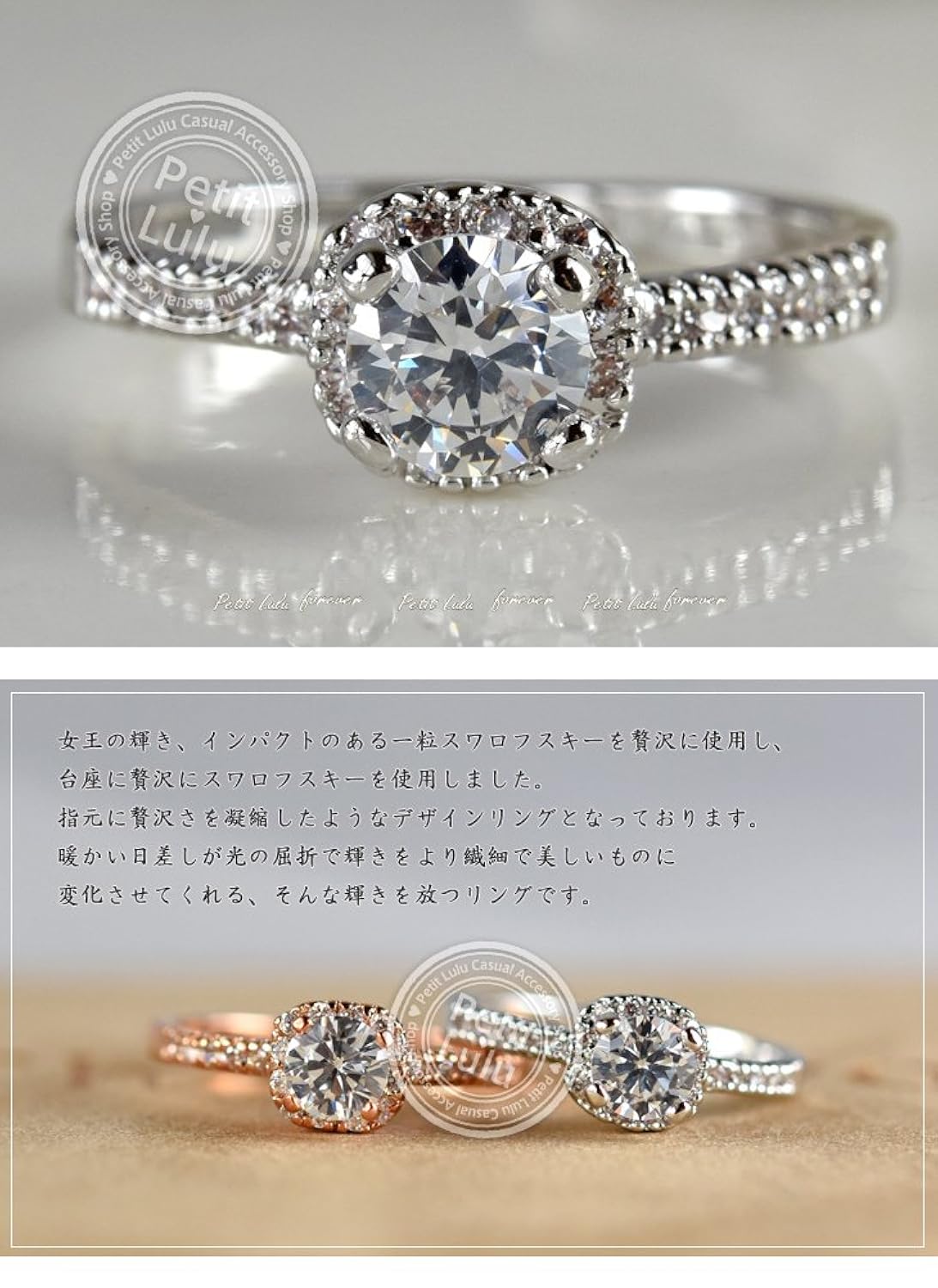 女王の輝き、インパクトのある一粒スワロフスキーを贅沢に使用し、台座に贅沢にスワロフスキーを使用しました。指元に贅沢さを凝縮したようなデザインリングとなっております。暖かい日差しが光の屈折で輝きをより繊細で美しいものに変化させてくれる、そんな輝きを放つリングです。