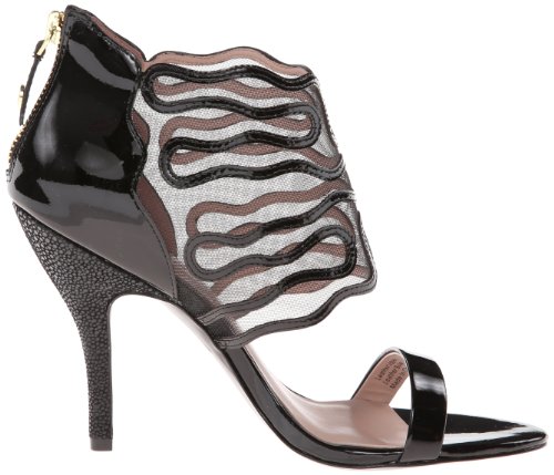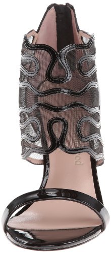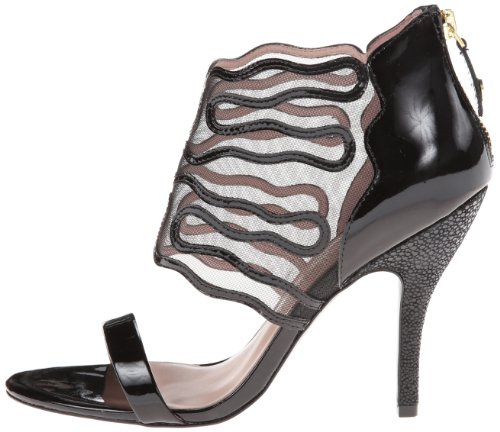 Open-toe dress pump with bootie-inspired vamp featuring mesh and patterned patent-leather accents