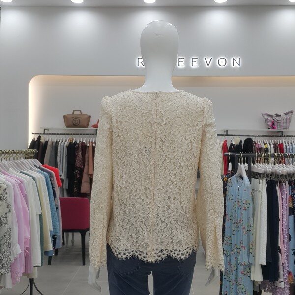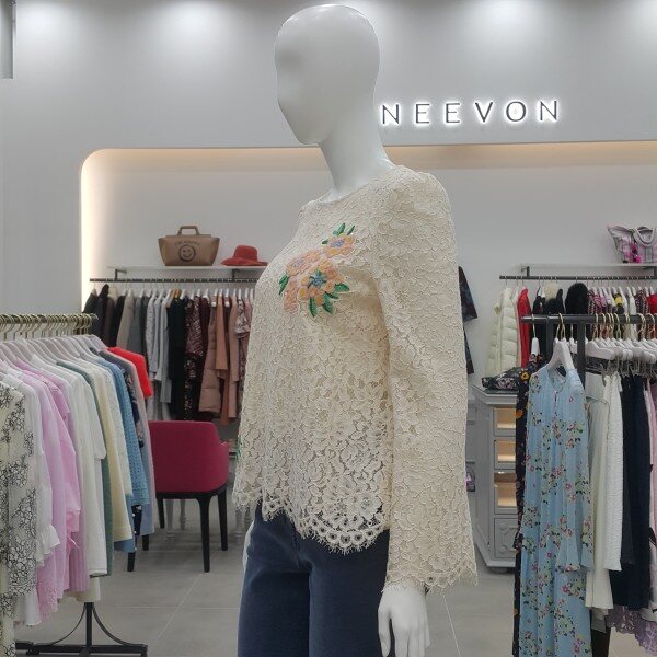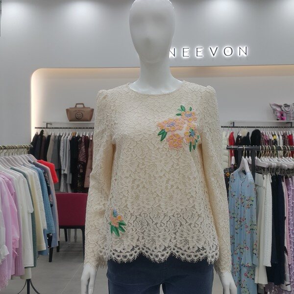 레이스 원단에 컬러감이 사랑스러운 꽃모양의 자수를 놓은 블라우스입니다.레이스 스칼럽 단 처리가 되어 고급스럽습니다.