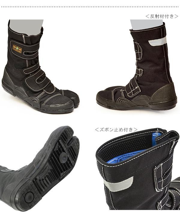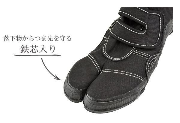 | 高強度の鉄製先芯入りで、危険な落下物からつま先を守ります。柔軟性のある吸盤付きゴム底装着だから使い心地も良し!!しっかりフィットの三連面ファスナー式で着脱も簡単!!鳶たび機能を活かした安全シューズです。 |