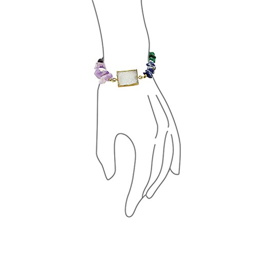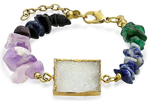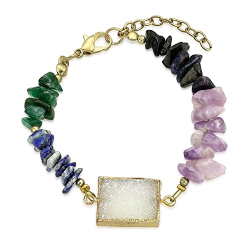 A majestic array of cool tones are displayed in this 7in gold plated iron and mixed natural and synthetic gemstone bracelet. The centerpiece is a rectangular, white druzy agate stone with a gold plated accent. Around the center stone are amethyst, lapis lazuli and synthetic malachite chips, to help you harness the mystical powers of crystal healing.