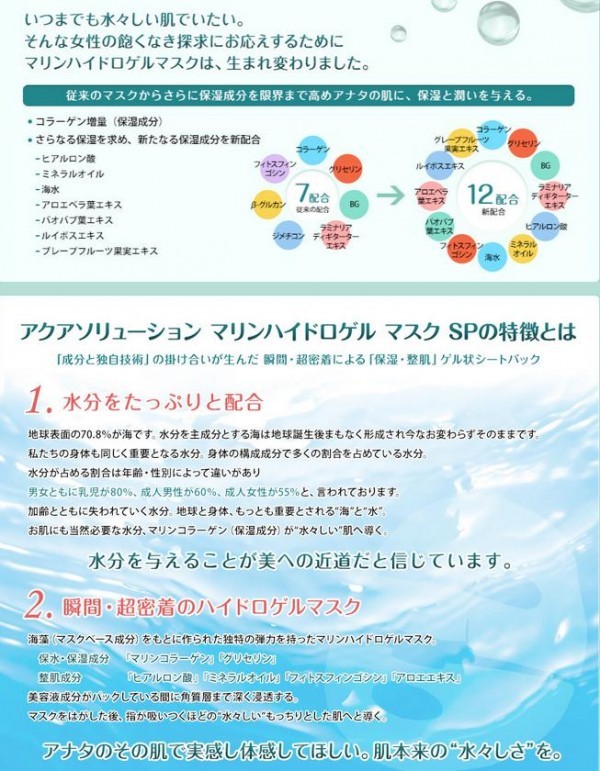 | 成分 | 水、BG、グリセリン、ミネラルオイル、加水分解コラーゲン、ヒアルロン酸Na、海水、フィトスフィンゴシン、セルロースガム、ローカストビーンガム、カラギーナン、水添ポリデセン、ポリソルベート20、ポリアクリル酸Na、トリデセス-6、バオバブ葉エキス、アロエベラ葉エキス、ルイボスエキス、グレープフルーツ果実エキス、ラミナリアディギタータエキス、香料、EDTA-2Na、フェノキシエタノール、メチルパラベンNa、青1 |