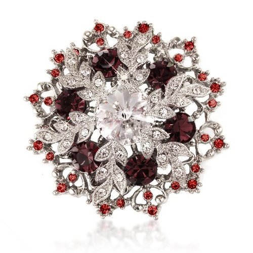 Siam Red silver tone Crystal Brooch/Pendant, by Crystal Elegance. This brooch measures 5cm in diameter. An elegant silver colour brooch studded with a variety of seventy eye catching red crystals. A simple but intricate design to suit any woman who wants to make a statement of style and fashion. Ideal as the perfect valentines, birthday or wedding gift...It has a loop so it can also be worn as a pendant. Other colors also available. This item comes in a gold gift box with black velvet sponge lining. Elegant and quality item. Limited stock..