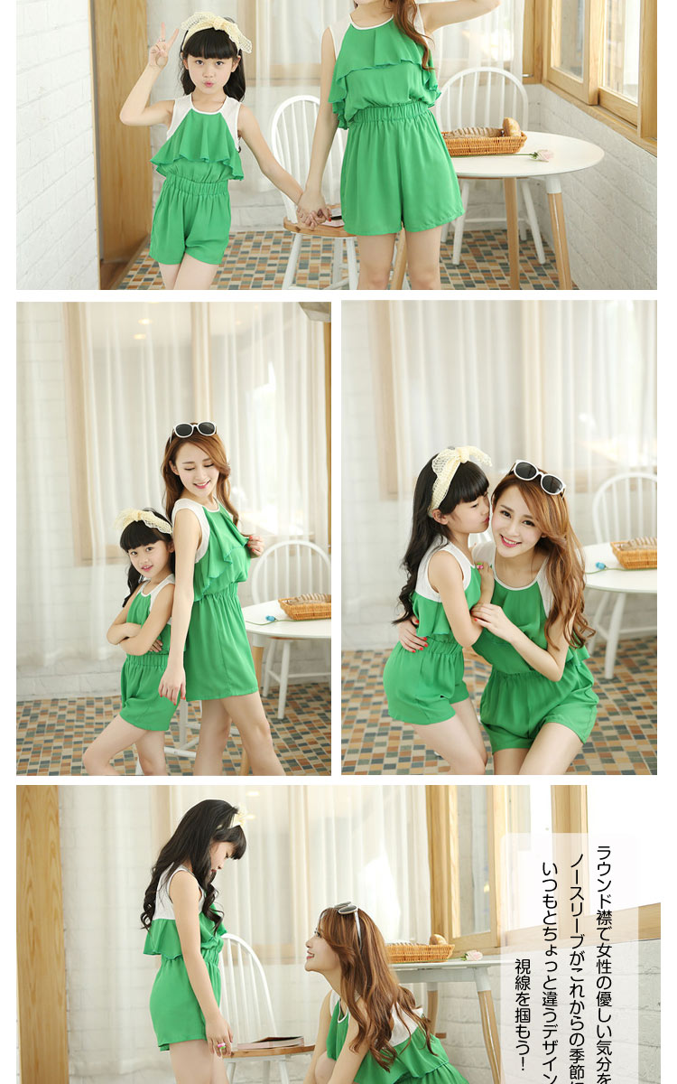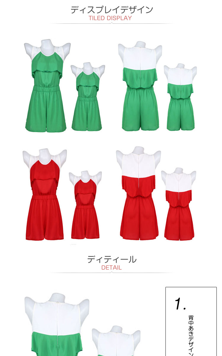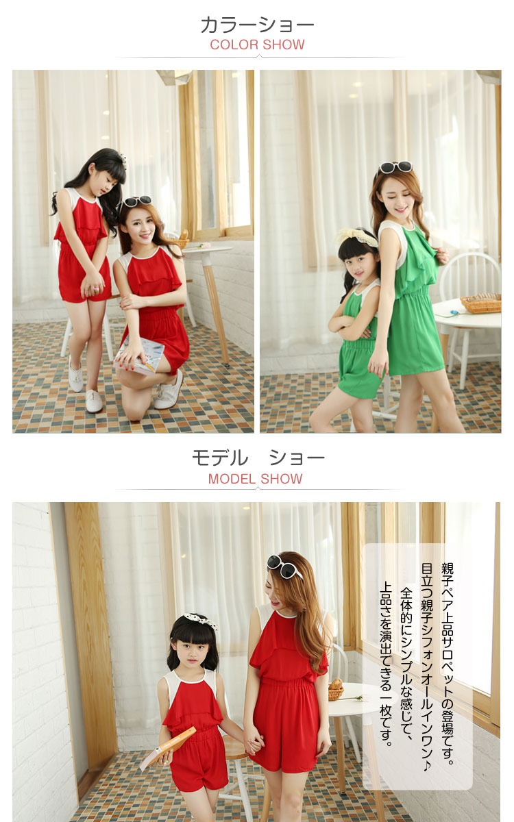 | 親子ペア上品サロペットの登場です。目立つ親子シフォンオールインワン?全体的にシンプルな感じで、上品さを演出できる一枚です。フロントで見ると、サロペットとして使えるアイテムですが、バックで見たら、セットな感じですね!ラウンド襟で女性の優しい気分を与えますね!ノースリーブがこれからの季節にピッタリ!いつもとちょっと違うデザインがみんなの視線を掴もう! | |