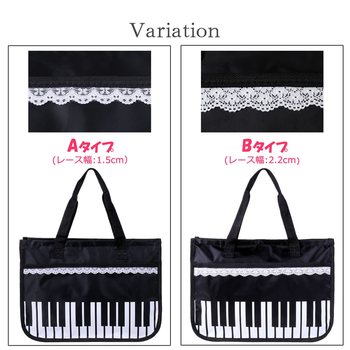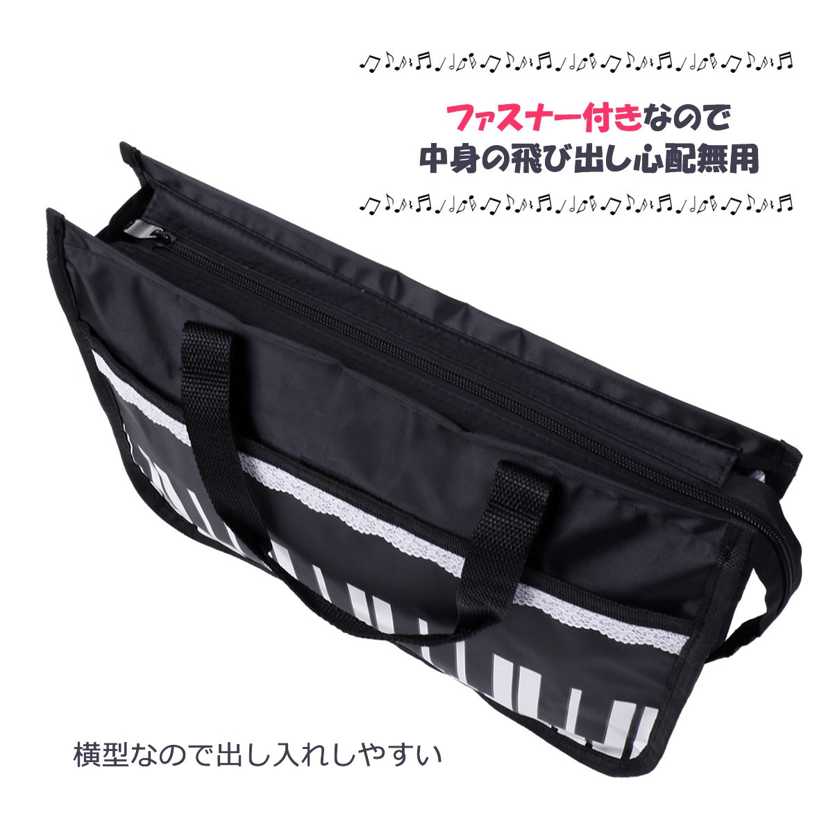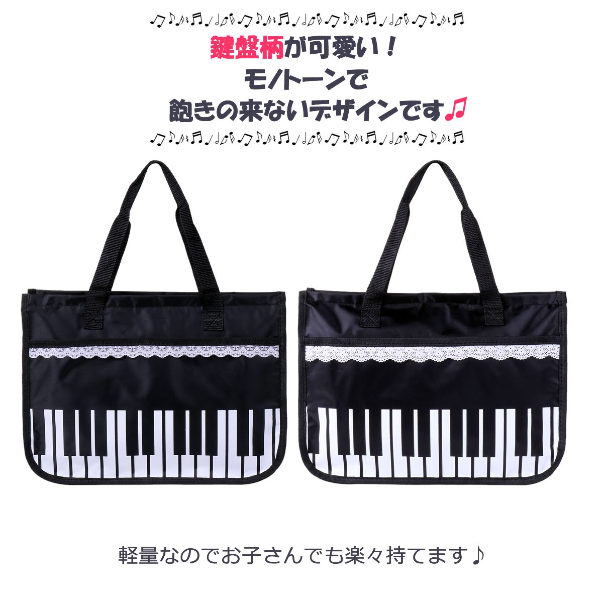 レース付きピアノ鍵盤柄のレッスンバッグ