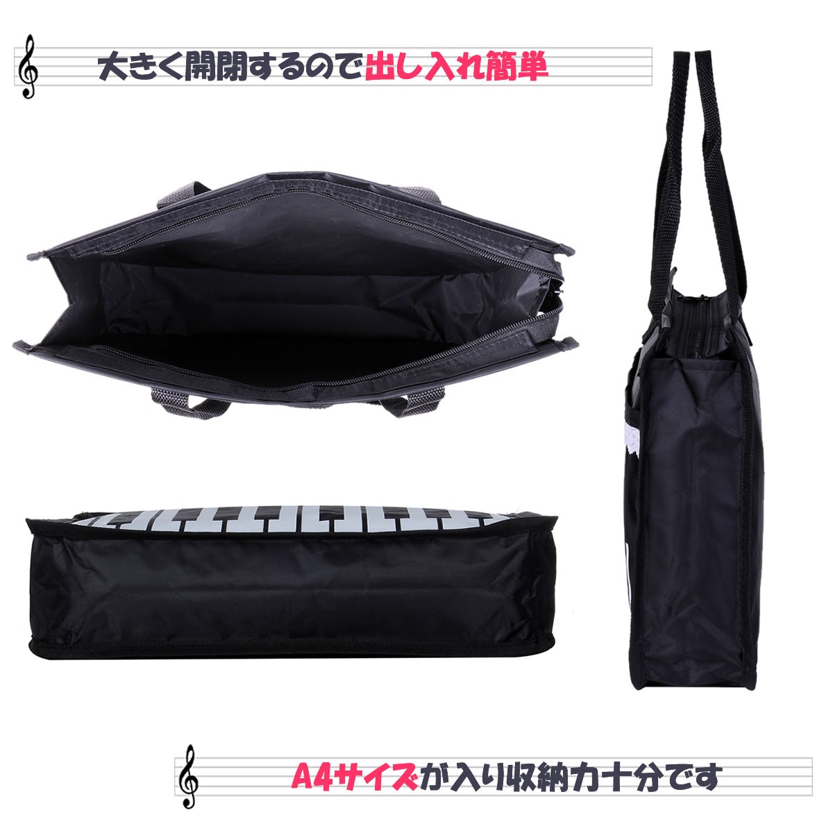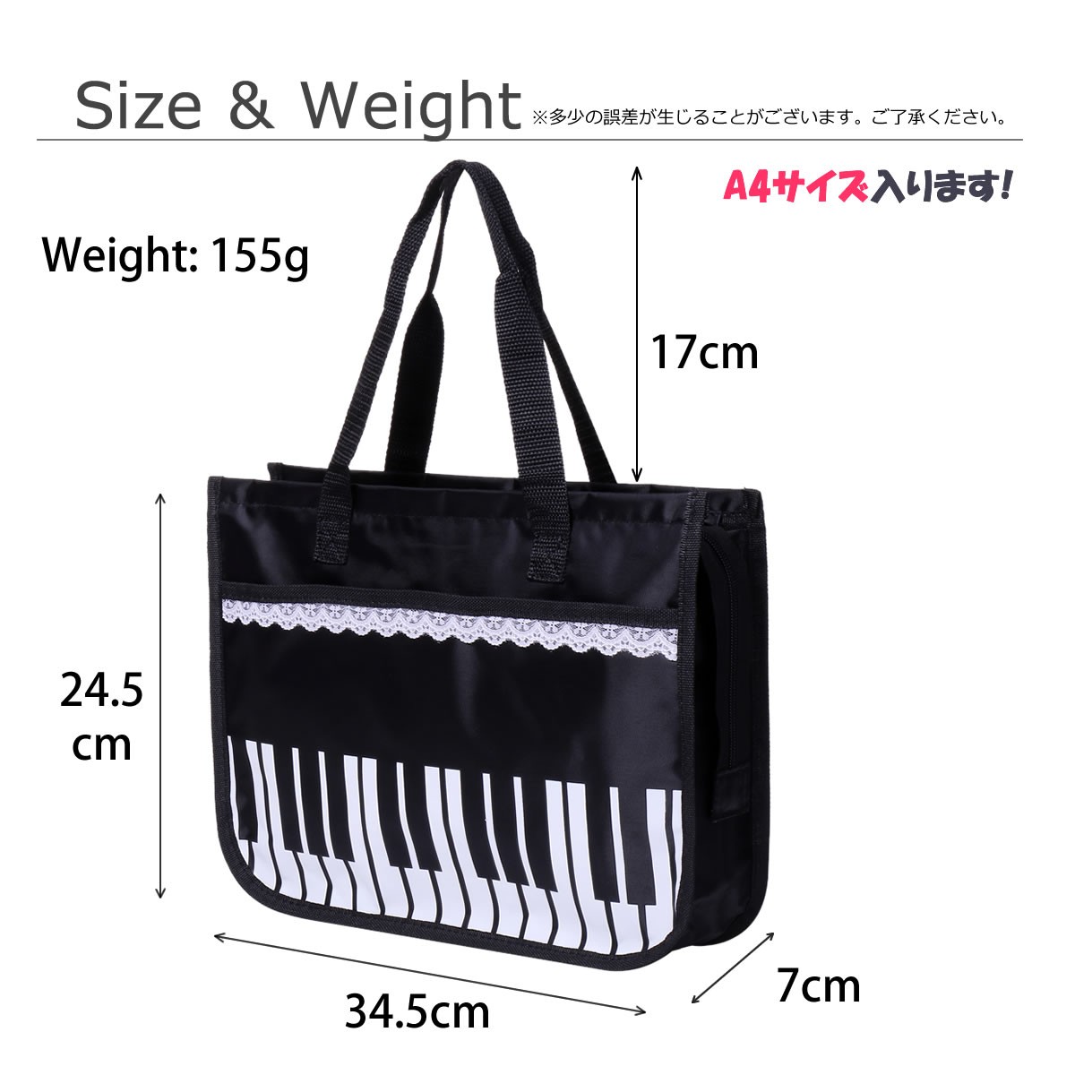 レース付きピアノ鍵盤柄のレッスンバッグさりげない可愛らしさをPLUS♪Aタイプ、Bタイプからお選びください。◇横型で出し入れしやすく、ファスナー仕様なので中身の飛び出しなど心配無用◆A4サイズが入るので便利◇7cmのマチ付き◆前面にポケットが付いているので小物などの収納可能◇軽量なのでお子さんでも楽々持てます◆オックスフォード生地使用で丈夫で防水効果があります【サイズ】(約)横34.5cm×高さ24.5cm×マチ7cm【重量】(約)155g【素材】オックスフォード生地【生産地】中国【注意】※ゆうメールでの発送となります。※配達日、配達時間の指定はお受けできません。※追跡番号はついておりません。あらかじめご了承下さい。