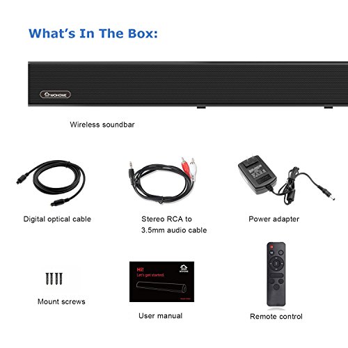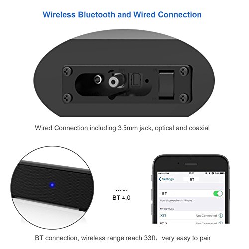 -. Feature : Powerful Sound Bar: built-in 2x 20w full range speaker, 2x 20w bass drivers and two bass reflex tubes, not only can output expansive audio and crystal-clear sound, but also bring the powerful bass; 38inch 2.0 channel, great for 42" or above TVs / Dual connection: wireless BT 4.0 for your smart device, range reach 10m/33ft; wired connection for your traditional device, support RCA, optical and coaxial, please note RCA cable and optical cable provided / DSP Technology: the surround sound system is designed with DSP Technology for amazing clarity and precision, it brings you an upgrading fantastic home theater experience / Super Easy Operation and installation: support touch control and remote control, very convenient to adjust playback settings including volume and track selection; mount kit provided, you can mount it on the wall or place it on the cabinet. / 100% Satisfaction Service:ene year warranty, 45 days money back guarantee, lifetime technical support,please feel free to contact us for any questions.