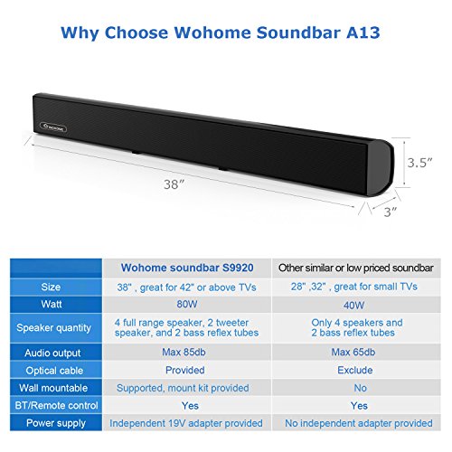 -. Title : Soundbar, TV Sound Bar Wired and Bluetooth Wireless Audio Speaker(80 Watt, 38-Inch, 4 Speakers,2 Bass Reflect Tubes, Remote/Touch Control, Wall Mountable, Model A13, Great for TVs, PC, Projectors)