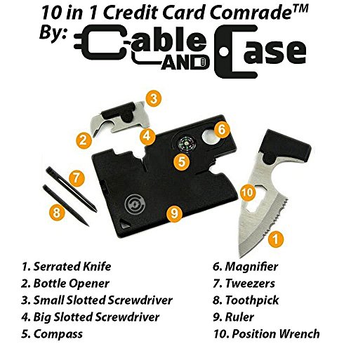 The Perfect Men's Or Woman's Gifts - Our Credit Card Tool Is The Best! The Men or women in your life will love it! This Survival Knife MultiTool Wallet Tool & Specialty Credit Card Knife By Cable And Case Is A Credit Card Sized 10-in-1 Tool Is Extremely Compact And Useful. 10 Tools In All, Including 1. Serrated Knife 2. Bottle Opener 3. Small Slotted Screwdriver 4. Big Slotted Screw driver 5. Compass 6. Magnifier 7. Tweezers 8. Toothpick 9. Ruler 10. Nut or bolt wrench