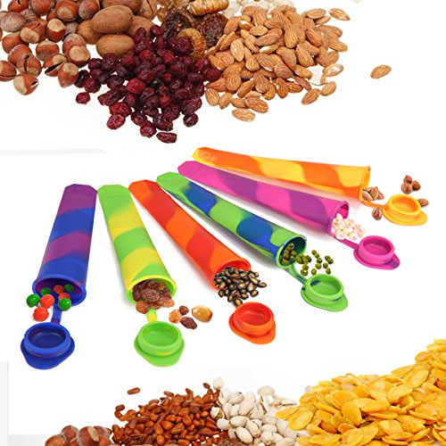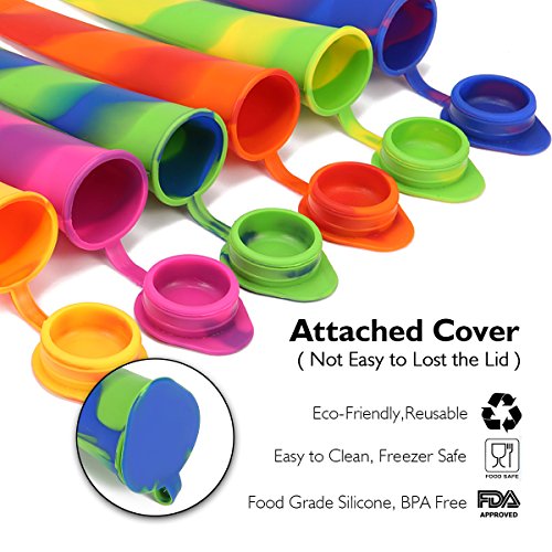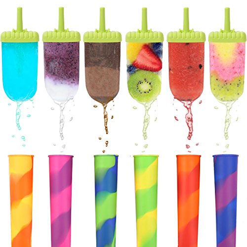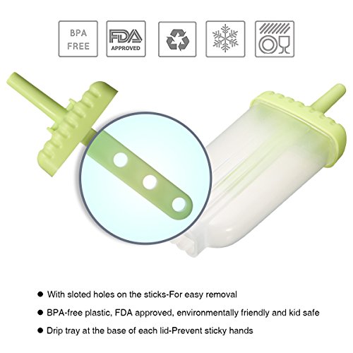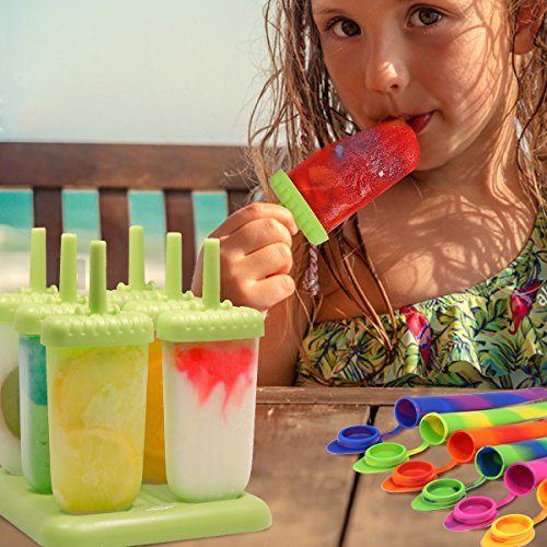 SIMPLE TO USE: 6 Green Ice Pop Molds designed for easy to use and clean, totally non-stick. Include slotted holes in the sticks for easy removal after freezing. Silicone Ice Lolly with 6 fun and vibrant colors has a matching lid. The clever conical shape lets you drink the last drops without the melted mess or drips. Both are easy and fun for adults and kids to use.