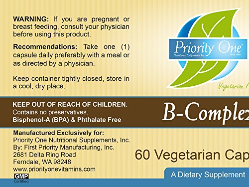 -. Binding : Health and Beauty -. Brand : P.R.Iority One Vitamins -. EAN : 0815354020167 -. Feature : NERVOUS SYSTEM: Essential for proper functioning of the nervous system and healthy nerve cells as well as nutritionally supporting the body during the stresses of everyday life.* / ENHANCED ENERGY: high potency formulation combining essential b vitamins, minerals in an herbal base. / MOOD SUPPORT: B vitamins support healthy cognitive and nerve function as well as memory, mood, and emotional well-being* / Natural Ingredients. Natural formula. This product is non-GMO and gluten free. Made in USA at FDA cGMP Registered Facility. -. IsAdultProduct : 0 -. Label : P.R.Iority One Nutritional Supplements Inc./First P.R.Iority Manufacturing Inc. -. Manufacturer : P.R.Iority One Nutritional Supplements Inc./First P.R.Iority Manufacturing Inc. -. MPN : 1186 -. PackageQuantity : 12 -. PartNumber : 1186 -. ProductGroup : Health and Beauty -. ProductTypeName : HEALTH_PERSONAL_CARE -. Publisher : P.R.Iority One Nutritional Supplements Inc./First P.R.Iority Manufacturing Inc. -. Studio : P.R.Iority One Nutritional Supplements Inc./First P.R.Iority Manufacturing Inc. -. Title : P.R.Iority One Vitamins B Complex 60 Vegetarian Capsules - Energy Complex - Mood Support -. UPC : 815354020167