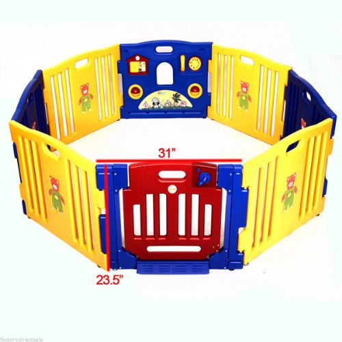 - Feature : Feature Brand New Perfect For Baby And Children Activity Board: Picture House, Play Phone, Spinning Balls Adjustable Size And Shape Swinging Hinged Doors With Safety Lock 8 Panels That Are Interchangeable To Increase Or Decrease Playpen Size Or Shape Built -In Activity Board That Features A Picture House, Spinning Balls, And Play Phone / Specifications Material: PE Activity Board: Picture House, Play Phone, Spinning Balls Assembled Dimension: When 8 Panels Assembled Diameter 74 Inches Individual Panels: 31" W X 23.5" H Thickness: 1.5 Inchs Approximately Weight: 35 Lbs / Package Include:1 X Playpan 1 X Instructions / Product Description This Baby Playpen For Kids Has 8 Panels.The Material Is Safe And Non-Toxic, You Can Rest Assured To Use. This Playpen Features A Picture House, Ball Spinners, Play Telephone And A Swinging Hinged Door With Safety Lock. In Addition, You May Assemble This Gate As Different Form. The Swinging Hinged Door Is Equipped With A Safety Lock To Keep The Kids In. The Size And Shape Of Playpen Is Adjustable By Adding Or Removing Panels Or By Placing Panel In Different Shape. It Also May Create Interest And Encourage Mobility For Your Child. Makes A Great Holiday Gift.