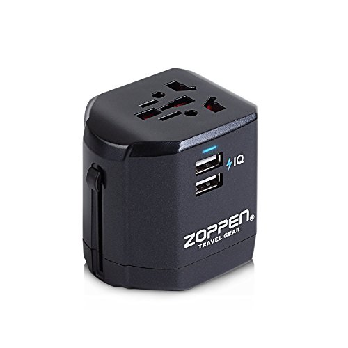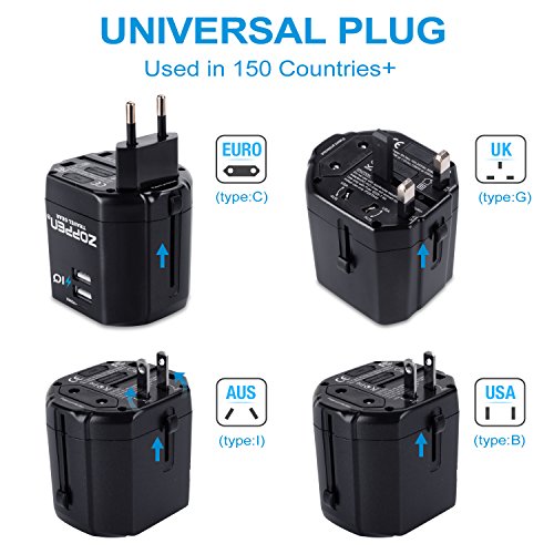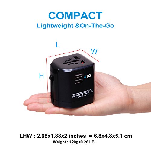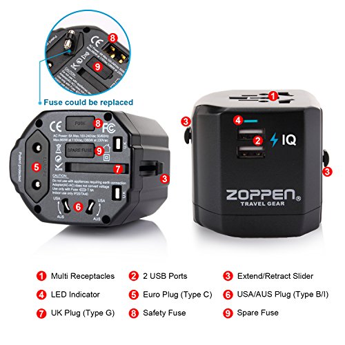 Zoppen International Travel Adapter Dual-USB Charging Port Wall Charger, All-in-one Universal Plug (US UK EU AU/CN) w/ Worldwide Outlet / Schuko & AC Socket - Safety Fuse and Surge Protector, Black