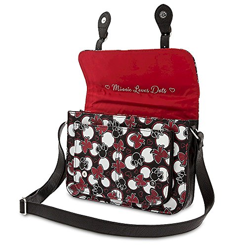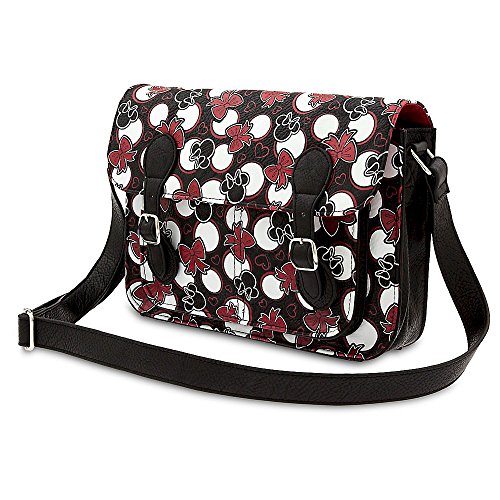 -. Feature : Mail carrier style satchel, Faux leather grain / Screen P.R.Int Minnie icons, bows, and polka dots pattern / Flap top, Faux buckles with magnetic snap closure, Exterior pocket, Zip interior pocket, Lined / Shoulder strap, Silvertone hardware / 9'' H x 11'' W x 3 1/2'' D; Strap drops 20'' L