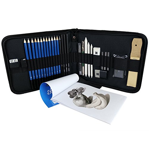 33 Piece Professional Art Kit Drawing Pencils with Sketch Kit, Charcoal Pencils, Graphite Pencils, Erasers and Free Sketchpad with Kit Bag