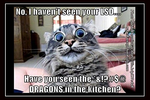 1 Medium Magnet ~ LSD DRAGONS ~ refrigerator fridge magnet, approximately 3.75x2.5 inches (9.53x6.35 cm), meme decorative magnetic sign plaque photo, pet tabby cat accidentally eats LSD sees dragons
