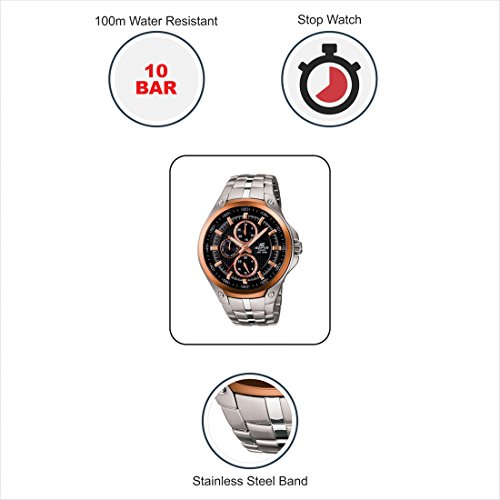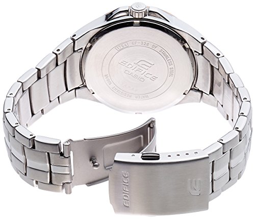 Brand, Seller, or Collection Name:Casio Model number:EF-326D-1AVDF (ED335) Model Year:2011 Item Shape:Round Dial window material type:Mineral Display Type:Analog Clasp:Deployment-clasp Case material:Two Tone Case diameter:45 millimeters Case Thickness:11 millimeters Band Material:Stainless Steel Bracelet Band length:Men's Standard Band width:22 millimeters Band Color:Silver Dial color:Black Calendar:Day Special features:measures-seconds, Chronograph, Luminous Item weight:9.60 Ounces Movement:Quartz Water resistant depth:100 Meters