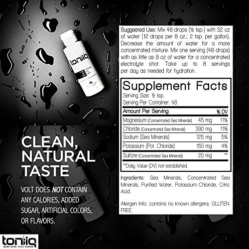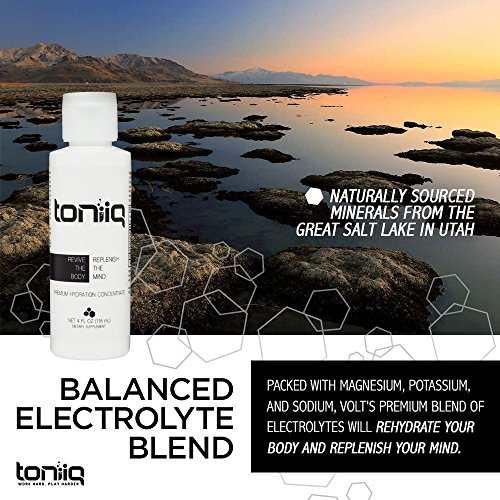 Toniiq Volt Electrolyte Concentrate features a premium blend of electrolytes to rehydrate your body and replenish your mind.* Packed with a nutritionally significant fusion of magnesium, potassium, sodium and chloride, Volt offers a clean and natural taste and does not contain any calories, added sugar, artificial colors, or flavors. For a refreshing twist on hydration, create a custom beverage by adding Volt to your water with a twist of lemon, lime or other preferred flavor. Control the concentration of your beverage by adding the desired amount of Volt to your water.