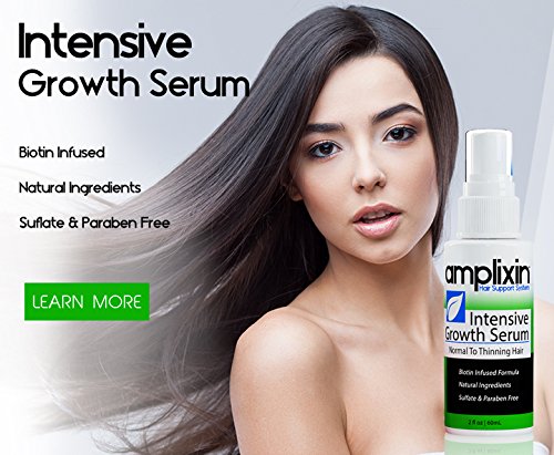 Amplixin Intensive Growth Serum is a natural, leave-in hair product that restores moisture and shine to the scalp and roots. Biotin infused formula adds volume and body to damaged follicles. Using the latest research, technology and natural botanical extracts, Amplixin Intensive Growth Serum stimulates roots to promote healthy hair growth. Benefits: Doctor approved product. Moisturizes Scalp and Roots. Deep Cleanses Follicles. Improves Hair Appearance. Biotin Infused Formula. Sulfate and Paraben Free. Active Ingredients: Caffeine - International Journal of Dermatology concluded that caffeine applied topically can act as "a stimulator of human hair growth." Caffeine is easily absorbed by the skin and can promote healthy-looking hair. Biotin - Since biotin is part of the Vitamin B group, it helps maintain healthy hair. When hair becomes unhealthy it can become fragile, break more easily and possibly fall out. Some women may experience hair loss during and after pregnancy and biotin may help reduce this type of hair loss, according to the American Pregnancy Association. Aloe Vera - Native Americans have long used Aloe Vera inner gel to keep their hair healthy and prevent it from falling out. It helps heal any damage on the scalp, cleans the pores, relieves irritation and maintains proper balance in the scalp.Feature