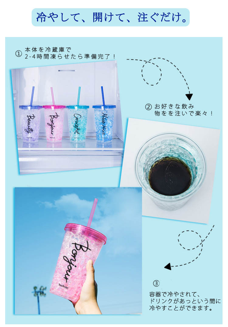 | 本体を冷蔵庫で2-4時間凍らせたら準備完了!お好きな飲み物をを注いで楽々!容器で冷やされて、ドリンクがあっという間に冷やすことができます。 | |
