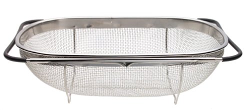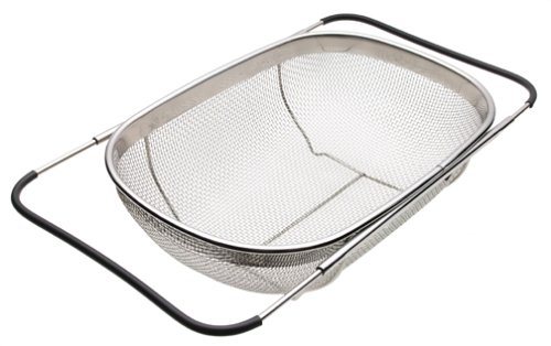 -. Feature : 13-1/4-by 9-inch expanding colander / Crafted of corrosion, stain, and odor-resistant stainless steel / Wire mesh basket with reinforced steel supports and loop legs / Rubber-coated handles slide out to 22 inches to fit most sinks / Safe to use in dishwasher