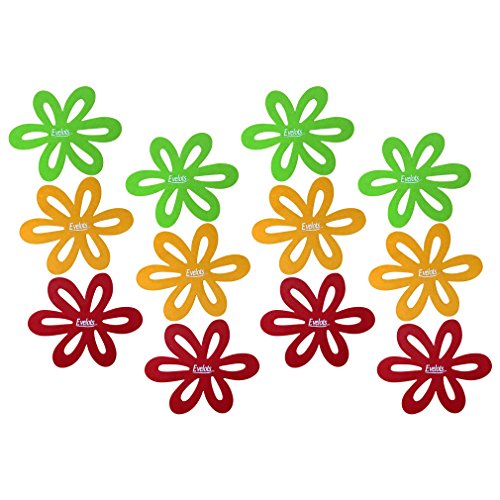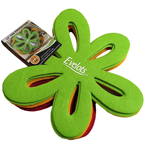 These petal shaped pot, pan, and dish protectors help avoid scratches and other damage caused by stacking kitchenware. Set of 12 comes with 4 Red, 4 Green, and 4 Orange. Simply place them between pots, pans, bakeware or glass dishes. They provide a layer of protection against unwanted markings and cracks. They are also great to help prevent items from locking together when stored for long periods. Approximate diameter is 12". Pots, pans, and dishes not included. *Evelots is a brand of Green Mountain Imports, LLC and is exclusively distributed by Green Mountain Imports.*Evelots has more than 500 products to offer. Please don't forget to visit our Amazon store.Feature