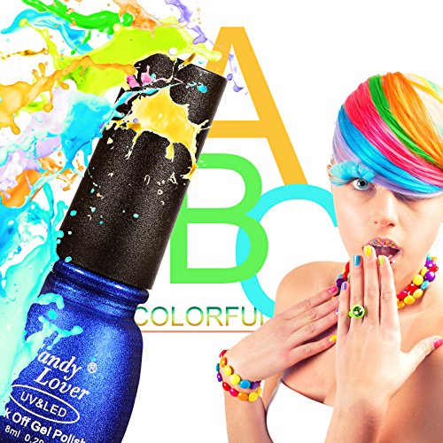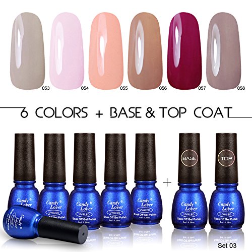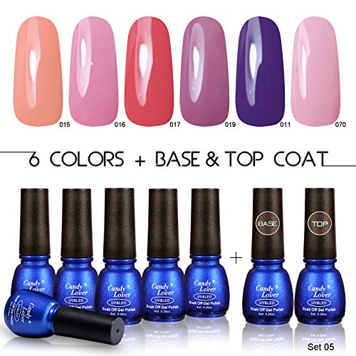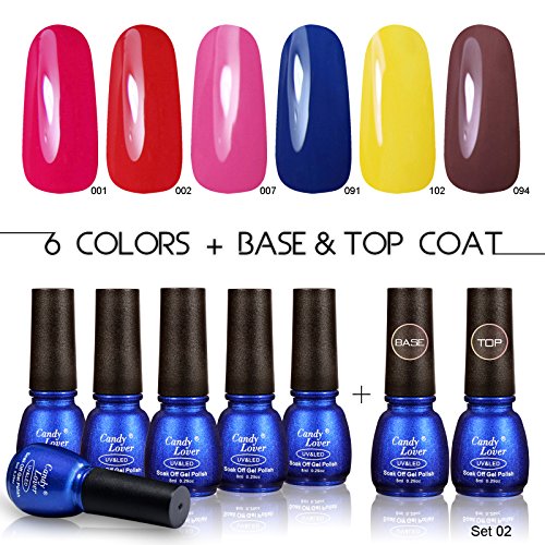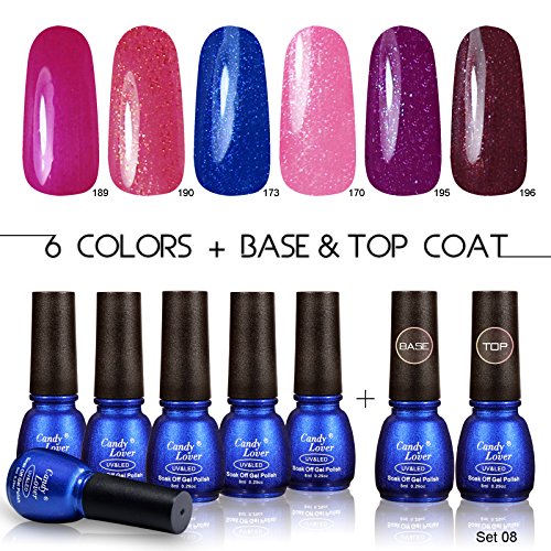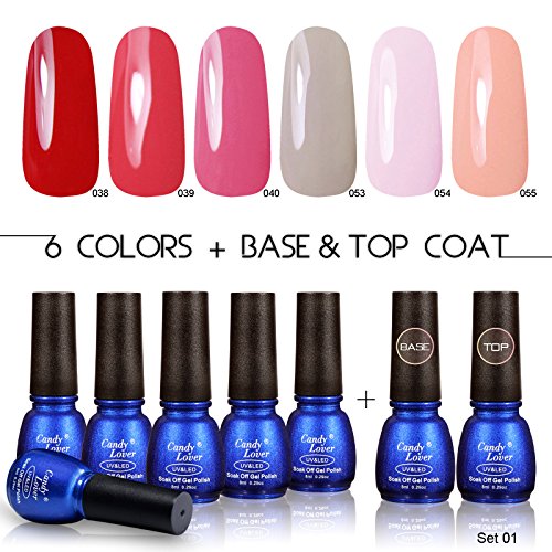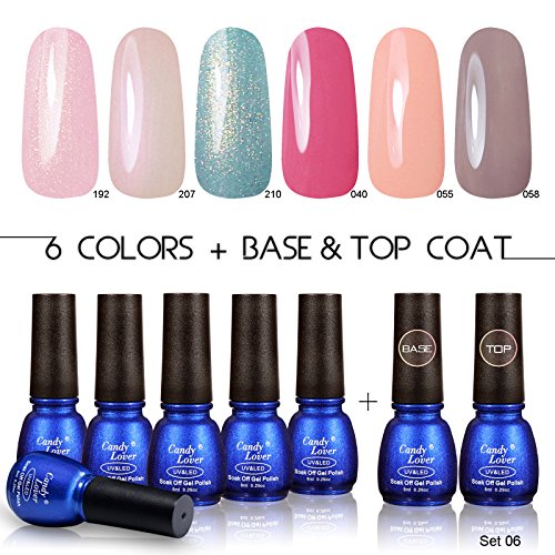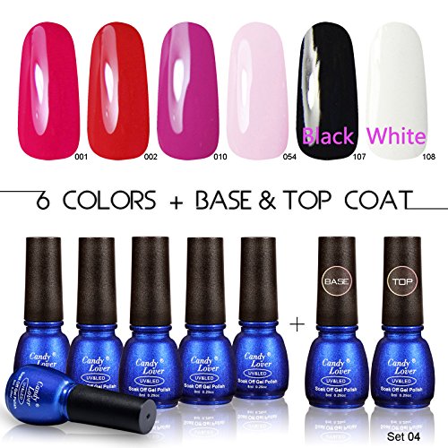 Package Included: 6pcs Gel Polish in different colors + 1pc Base Coat + 1pc Top Coat (8pcs in total, 8ml per bottle!)